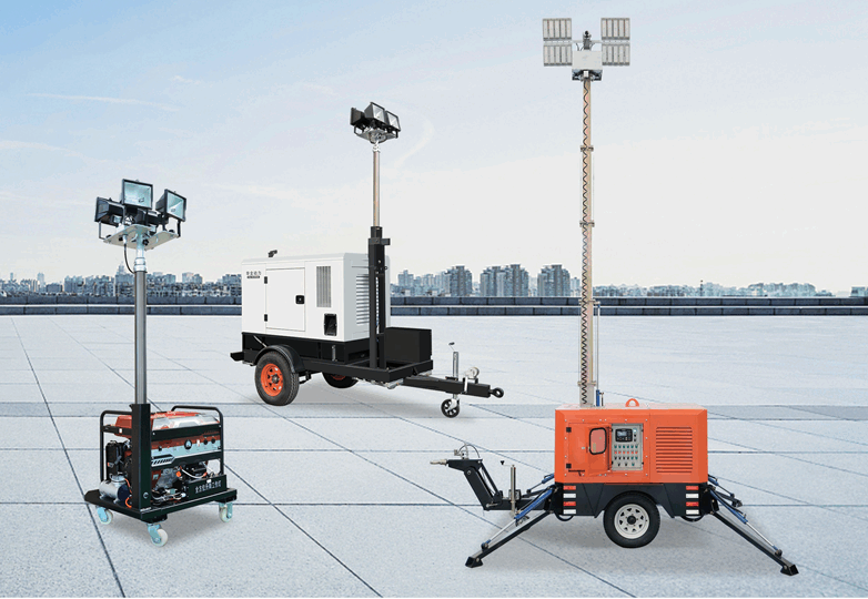 灯塔机组支持360°旋转、远程控制、单组单控、液压支撑、一键复位、一键升降、照明发电一体,配置高速移动拖车升降高度2.5-12米。