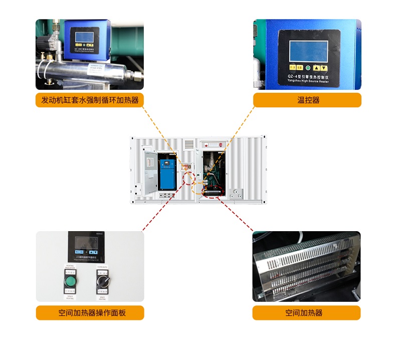 比如客户需在北方冬天较为寒冷的地方使用,我们可以给每台集装箱内为机组安装了机油加热器和冷却液加热器两个暖风设备,即使在现在这种较为极端的严寒天气,也能让机组快速进入工作状态,而不必担心低温困扰。