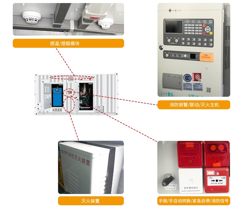 消防系统由消防主机、感温感烟模块、灭火装置、手报模块、手/自动转换模块、紧急启停模块、消防警铃、声光警示器、提示器等组成;
